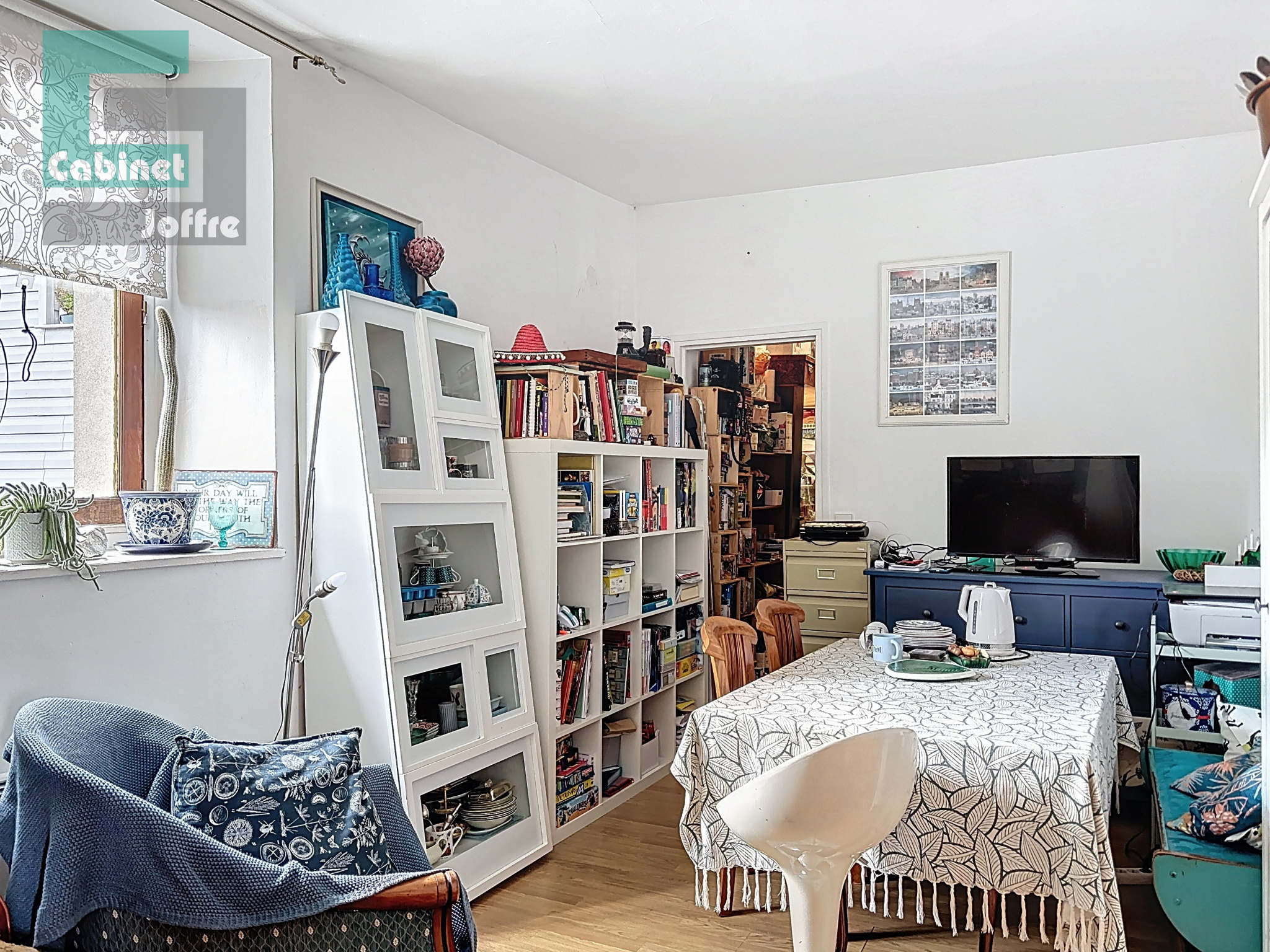Il comprend : entrée, cuisine, séjour de 13,44 m2, pièce de rangement, 2 chambres, salle de bains avec WC. Un débarras sur le palier et un autre au rdc.